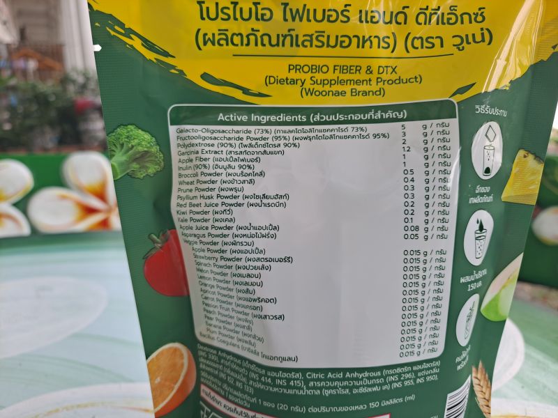 Галактоолигосахарид, порошок фруктоолигосахарида, полидекстроза, экстракт гарцинии, яблочное волокно, инулин, брокколи, пшеница, чернослив, шелуха подорожника, свекольный сок, киви, капуста, яблочный сок, спаржа, овощной порошок, клубника, шпинат, дыня, лимон, апельсин, абрикос, морковь, маракуйя, персик, груша и др.